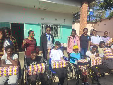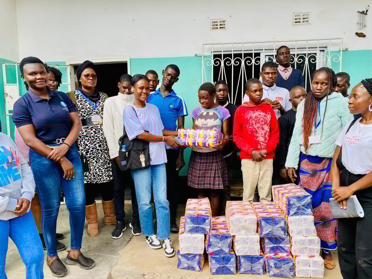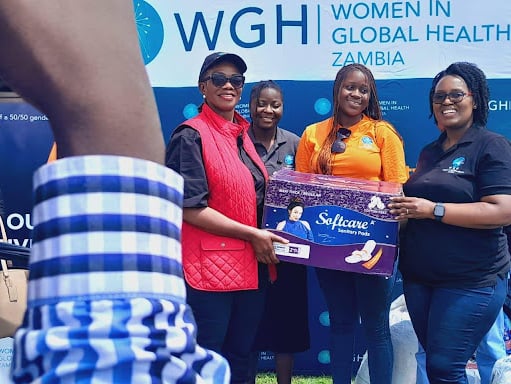 Alt: Women in Global Health Zambia making sanitary pad donations at Kanyama Community School (2025)